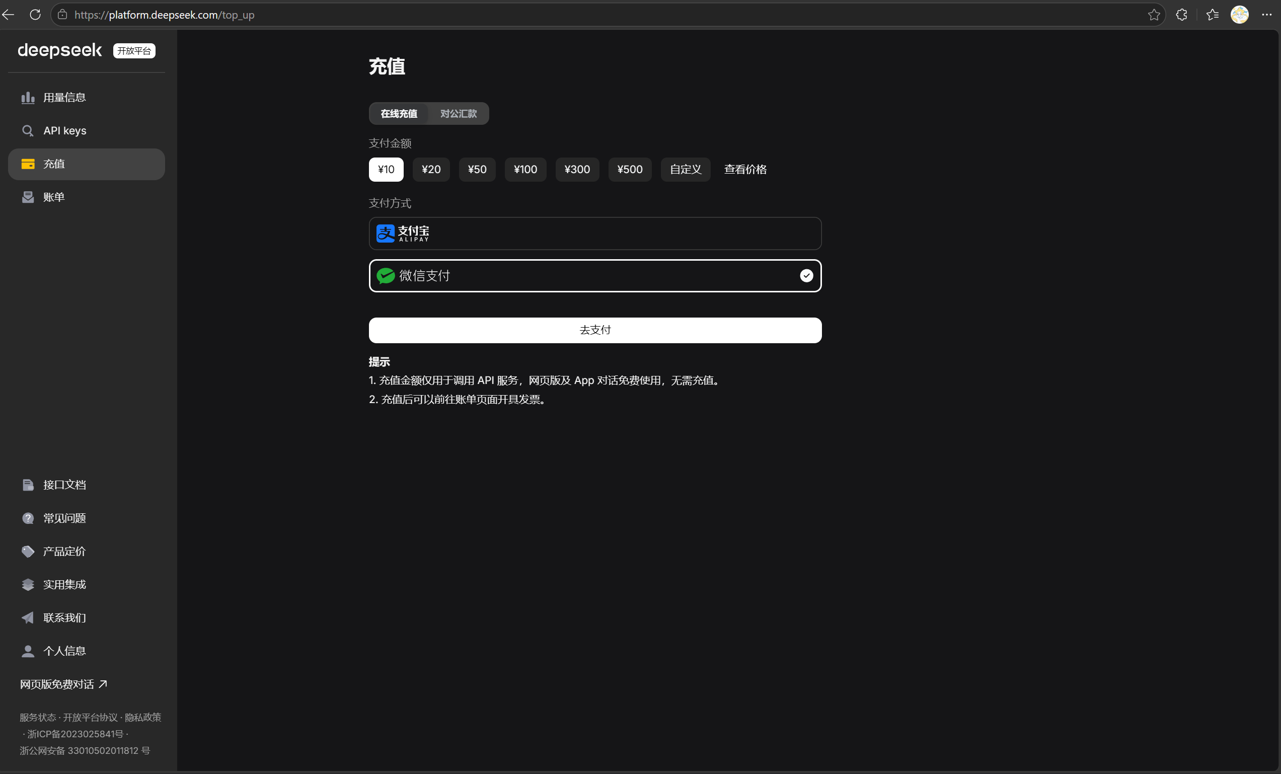 绑定个人信息后,继续查看左侧菜单栏【充值】选择你需要充值金额并选择你的支付方式